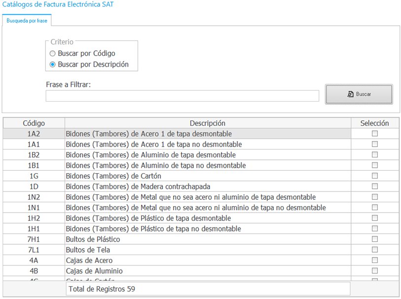 Luego diríjanse al módulo de Catálogos / Auxiliares (dentro de la aplicación de facturación) / Logistica / Embalajes.
