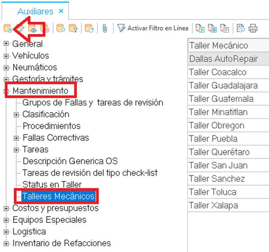 Modulo Catálogos / Auxiliares / Opcion Mantenimiento / Talleres Mecánicos